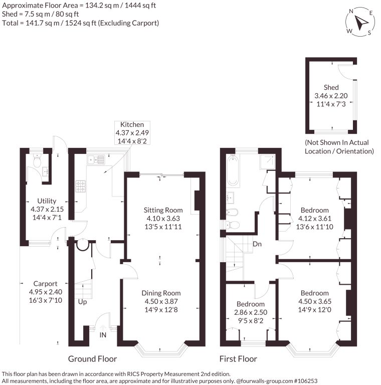 The garden to the rear is tucked away, surrounded by mature, well-established trees that provide both shade and natural privacy. A large shed offers storage, while a terrace at the back of the house is the ideal space to sit and enjoy the views. A lawn – deceptively spacious – leads through the garden, dotted with shrubs and bushes. At the front of the house, a private driveway and covered car port are accessed via double wrought iron gates, with a separate pedestrian gate leading to the front door. A parcel of green is set behind a low wall, bordered by mature shrubs – the perfect first impression.
