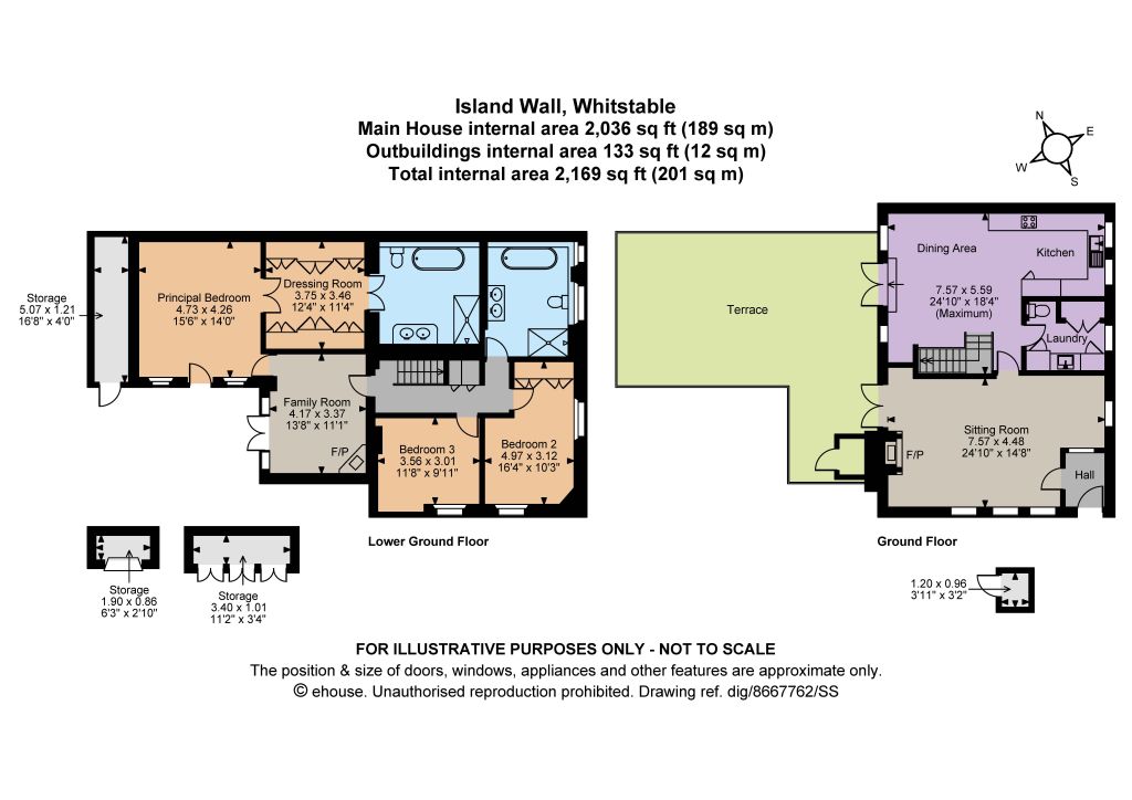 A sheltered sunken courtyard garden can be accessed through the driveway gates, family room and principal bedroom. It is paved for ease of maintenance and benefits from a useful walk-in store and an outdoor shower.