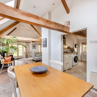 With an attractive façade of stone and brick elevations complemented by black-painted weatherboarding, The Studio is an appealing property which offers stylish architectural design with character details including an exposed beam framework and part-vaulted ceilings. The pillared entrance porch leads into a reception hall, where contemporary wood-floor covering provides practicality, extending across the open plan sitting/dining area. Oak timbers are showcased in the sitting room which is filled with natural light and offers French doors to the garden and sociable dining area. With natural flagstone flooring, the well-appointed kitchen is fitted with underfloor heating, cream-toned, contemporary cabinetry and a Belfast sink, with a stable-door out to the driveway. affording access to the outside.