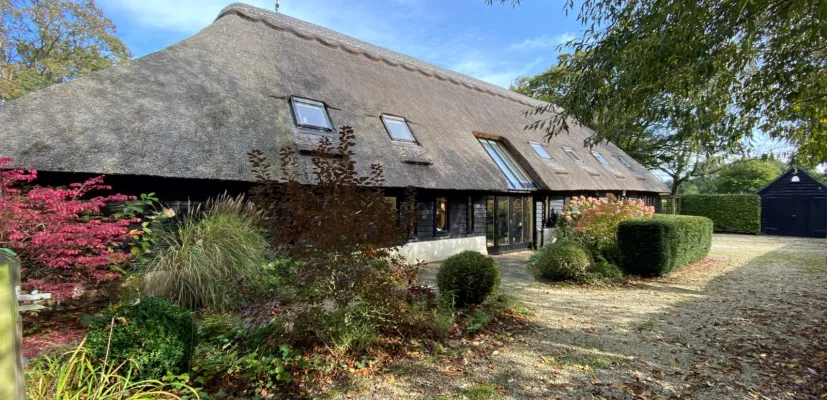 The beautiful, thatched wing of the house is home to a comfortable sitting room and a generous double aspect drawing room. Both showcase the fabulous timber-framed structure of the building, and French doors from the drawing room open to the gardens at the side of the house.