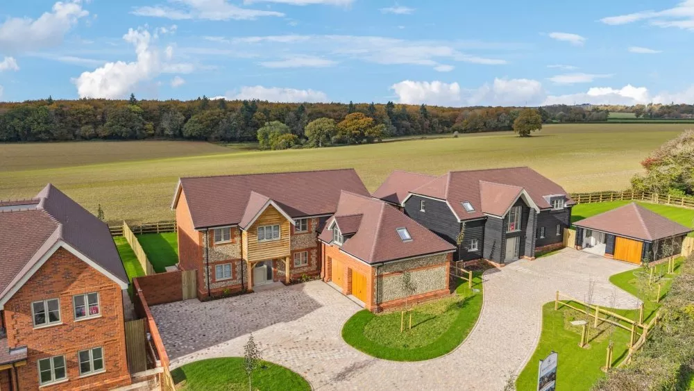 This is a home of rare quality in a remarkable setting. Surrounded by open countryside yet close to the village, Kingfisher at South Downs View offers the perfect balance of rural charm and modern style. Kitchens & Utility • Laura Ashley Designer kitchens featuring painted timber doors and inlay units • Single oven, single oven microwave, warmer drawer, wide five-burner induction hob and feature extractor hood • Integrated full height fridge and integrated full height freezer • Wine cooler to island • Silestone/granite worktops with matching splashbacks • Utility units and worktops to match kitchen, space for washing machine and tumble dryer Bathrooms & En-suites • Roca Laufen sanitaryware • Wall hung rimless pans with soft close seats and concealed cisterns • Wet room showers with valve, head soaker and handheld heads • Feature vanity unit and integrated basin to WCs, bathrooms and ensuites • Porcelanosa full height tiling to bathrooms and ensuites Heating & Insulation • Daikin monobloc air source heat pump, zoned underfloor heating to the ground floor • Low temperature radiators to the first floor, all thermostatically controlled • Predicted Energy Assessment “B” (TBC) Lighting & Electrical • LED downlights to hallways, kitchens, bathrooms and ensuites • External lights to front and rear • Electric car charging points • CAT 5 cabling to lounge and master bedroom] Internals • Oak veneered cottage-style doors • Feature open string staircases with feature oak treads and handrails • Porcelanosa floor tiles to entrance, kitchen/diner, cloakroom, bathroom and ensuites • Full height wall tiles to bathrooms and ensuites • Walk in/through wardrobes (fitted wardrobes units by customer) to master bedroom and built in wardrobe to bedroom two Externals • Low U value, pre-coloured hardwood timber, flush casement double glazed windows • Cedar retractable doors • Clay plain tiled roofs with matching bonnet hip feature tiles • Natural flint, feature stock bricks with plinth and features • Bi-fold doors to lounge and kitchen diner • French doors and balcony to master bedroom • Feature natural oak cladding • Outside tap • Fencing around the boundary