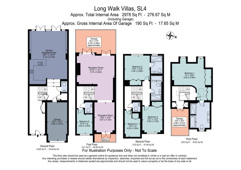 The remaining levels offer four bedrooms (one with an en suite shower room), a family bathroom and two cloakrooms, along with a principal suite that exclusively occupies the top floor and features a luxurious en suite bathroom and a private terrace with superb views of the Long Walk.