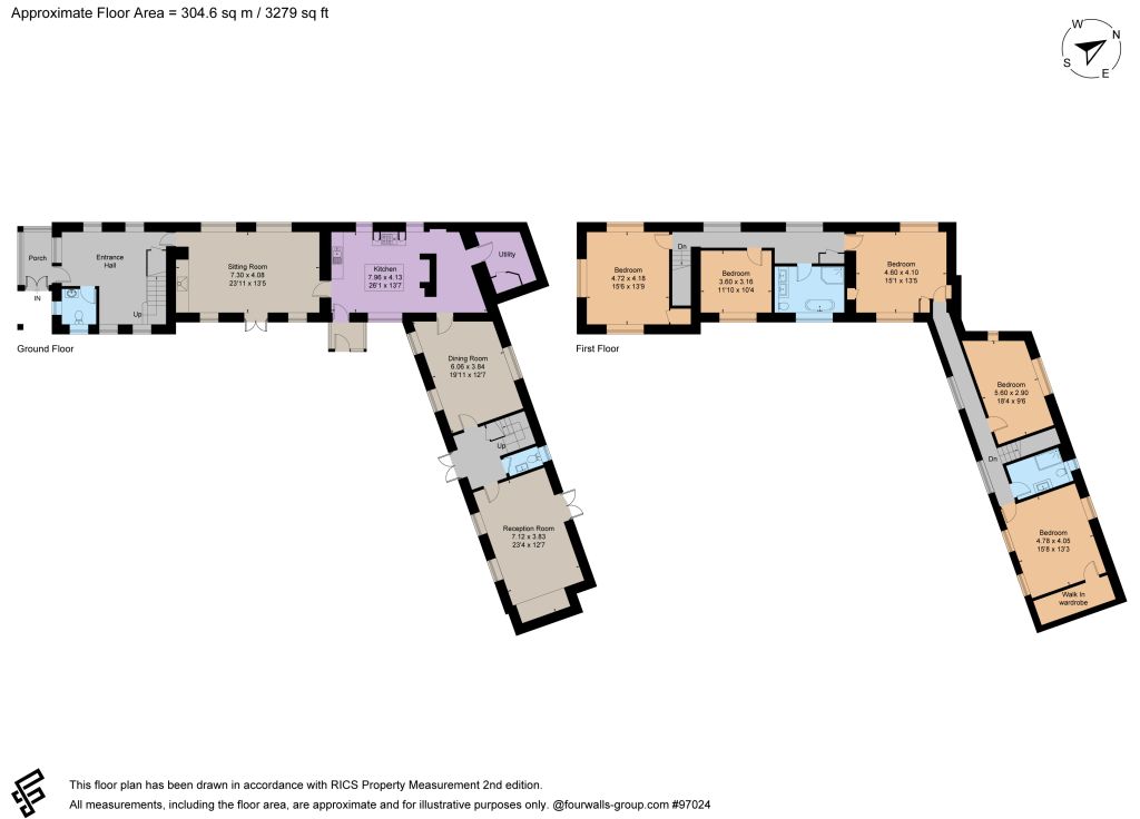 The first floor accommodates five well-proportioned double bedrooms, some featuring exposed timber beams. The principal bedroom enjoys dual aspect views and has a full-length walk-in wardrobe. Two modern bathrooms serve the upper floor, one featuring a stylish freestanding bath.