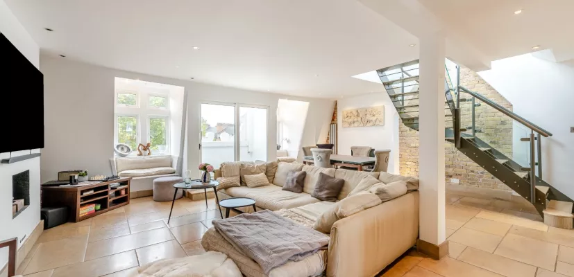 A sleek New York style loft-apartment (no lift) with two double bedrooms and a fantastic open-plan reception room with southwest balcony overlooking communal gardens. There is a large roof terrace ideal for entertaining and alfresco dining.