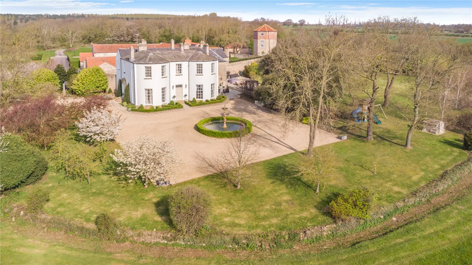 Set within parkland-style grounds, the estate also includes a small woodland area, along with mature fruit and blossom trees, enhancing the sense of tranquillity and seasonal interest. A standout feature is the all-weather tennis court, enclosed by a distinctive obelisk-style surround and complemented by extensive terraced seating—perfectly suited to both keen players and spectators alike.