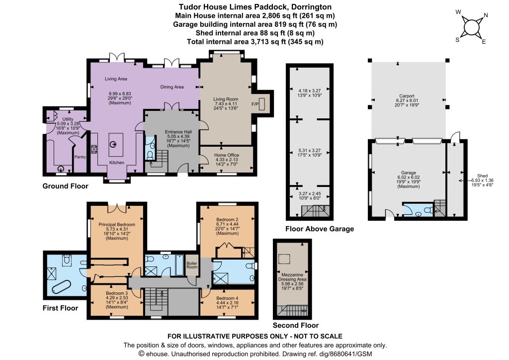 The house is set within a generous plot which backs onto open fields and offers far-reaching views across the surrounding Shropshire countryside towards the Stiperstones. The driveway to the front provides plenty of parking space and access to the detached carport and garage, which has an EV charging point, electric doors and a power point for a generator installation, as well as storage above. With existing power and water supply, this makes the garage block ideal for conversion into a self-contained annexe, subject to the necessary permissions.