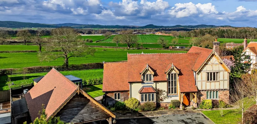Tudor House is a handsomely appointed executive home with exquisite styling and high-specification fittings throughout. Constructed in 2016 by a reputable local house builder, the property displays impressive timber-framed and rendered elevations outside, while inside there is striking exposed timber frame joinery, alongside elegant décor and contemporary features, such as underfloor heating throughout both levels. The property is well suited to growing or multigenerational families along with those working from home.