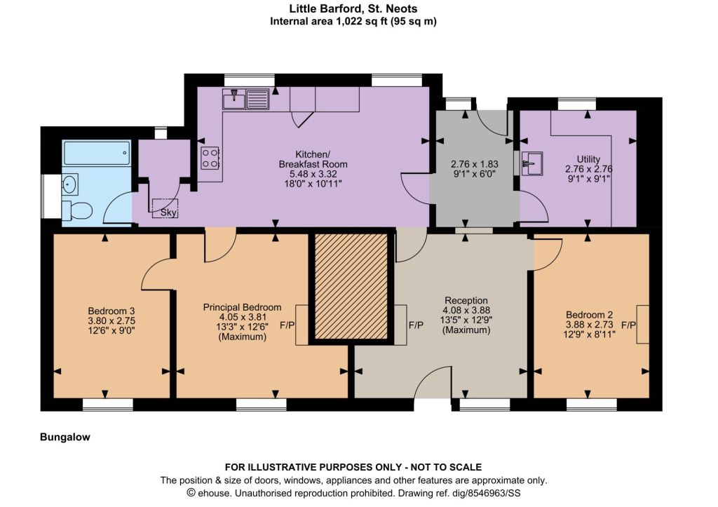 Kitchen/Diner - 5.48m x 3.32m A range of base units and drawers with wall mounted cupboards, tiled splash backs and stainless steel sink with drainer. Built in storage cupboard housing slatted shelves and hot water cylinder. Feature fireplace (not operational). Doors through to rear hallway, bathroom and principal bedroom.