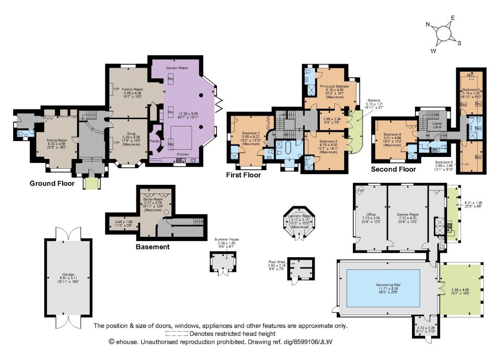 Upstairs, the impressive principal suite is complete with a dressing room, a well-appointed en suite bathroom and doors opening onto a private balcony overlooking the gardens. Two further bedrooms on this floor each benefit from their own en suite shower rooms, alongside a stylish family bathroom. The second floor offers three additional bedrooms and two further shower rooms, providing flexible accommodation for guests, older children or home working.