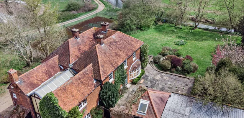 Mitchells Farm house, believed to date back to 1855, is a brick-built unlisted property of Georgian proportions, with bright and airy family accommodation and original character elements. A large glass atrium serves as entrance hall with an eye-catching bespoke spiral staircase. A sizeable utility room with generous storage cupboards and cloakroom flanks one side of the atrium, opposite sits a spacious country kitchen featuring terracotta pamment flooring and wood clad ceiling. A central corridor leads to four reception rooms, butlers’ pantry and staircase to the cellar. The drawing room is of particular note boasting duel aspects to the garden including a large south facing bay window, central brick-built fireplace and original wood panelled wall. A large half glazed door accesses the patio and garden room beyond. A well-proportioned study, dining room and sitting room completes the ground floor accommodation. The first floor provides 6 generous bedrooms, one benefitting from an en suite shower room, and two family bathrooms.