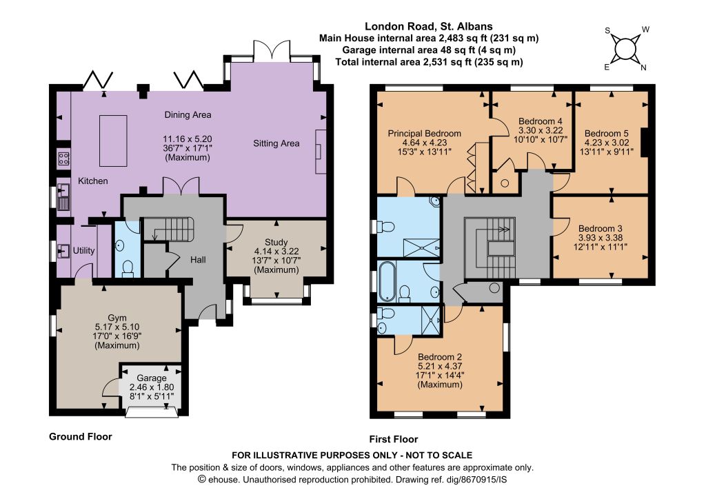 Additionally, the ground floor has a useful private study for home working, and a gym, which could be used as a family room in which to relax. The central staircase leads to a galleried first-floor landing, off which there are five immaculate double bedrooms. These include the generous principal bedroom with its full-height windows, fitted wardrobes and en suite shower room with a walk-in shower, as well as a connecting door to one of the additional bedrooms, which could be used as a dressing room if required. One further bedroom is en suite, while the first floor also has a family bathroom.