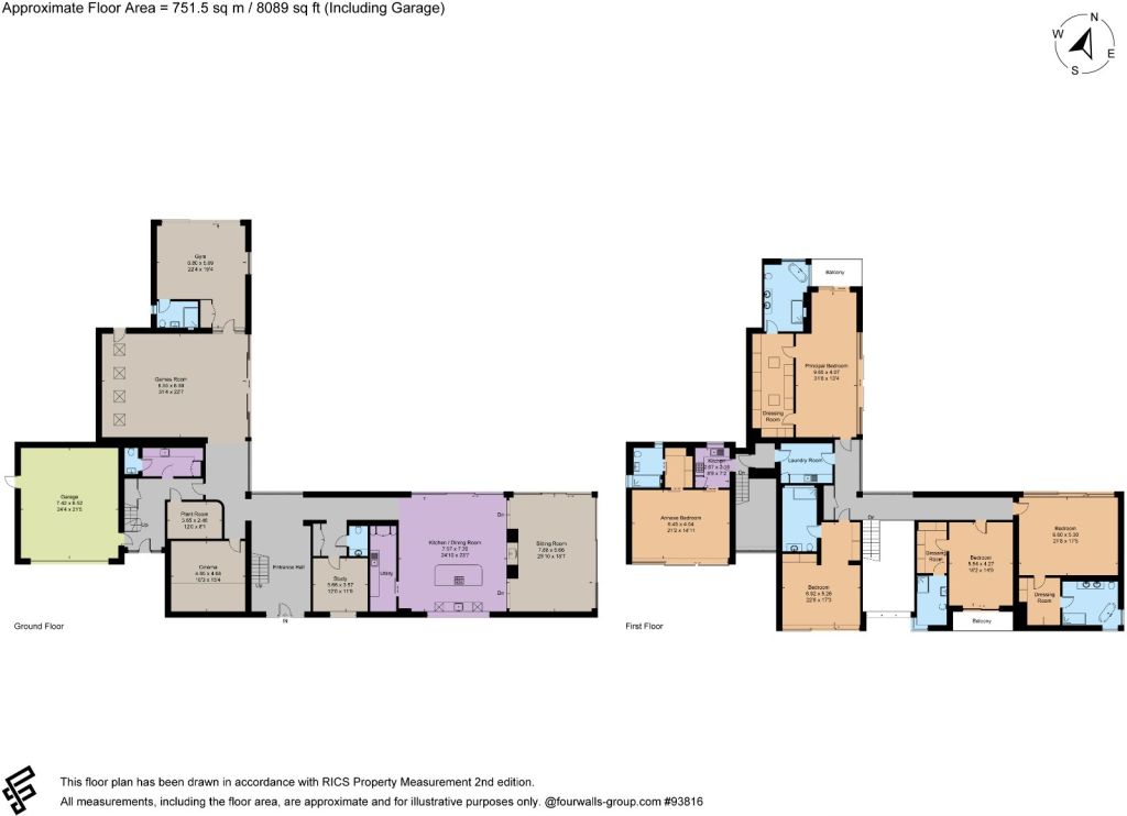 The ground floor reception rooms include the dual aspect sitting room, with its two walls of sliding glass doors, which open to create an outstanding inside/outside living space. Adjoining the sitting room in a semi openplan layout, and connected via a double-sided fireplace with a floating log burner, the kitchen and dining room also features sliding glass doors opening to the rear garden, as well as a bespoke fitted kitchen with a central island, a breakfast bar and integrated appliances. Further living and entertaining space includes the large games room (which could also be used as a further bedroom suite), the home gym, a fully fitted cinema room and a useful private study.