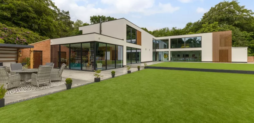 The property sits at the end of a long private driveway, which leads through woodland to the large, open tarmac parking area in front of the house. At the side there is an integrated double garage for further parking and storage or workshop space. The walled garden to the rear of the house features a generous patio for all fresco dining, an outdoor heated swimming pool with its own sun terrace, immaculate terraced artificial turf lawns, a grassy meadow, and a halfcourt basketball court.