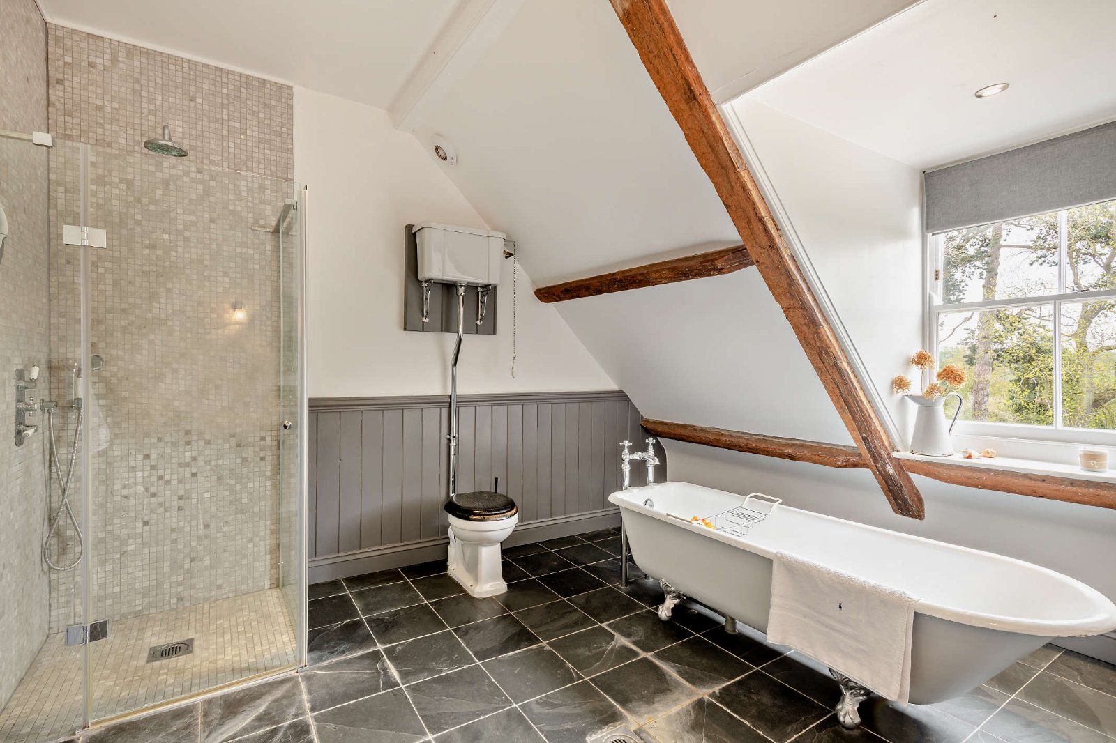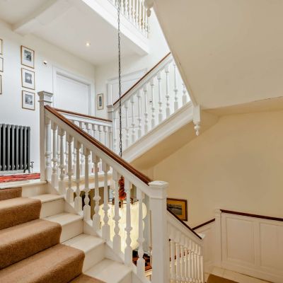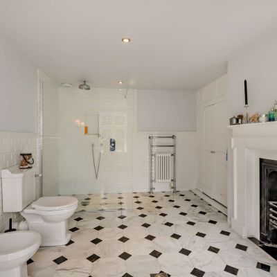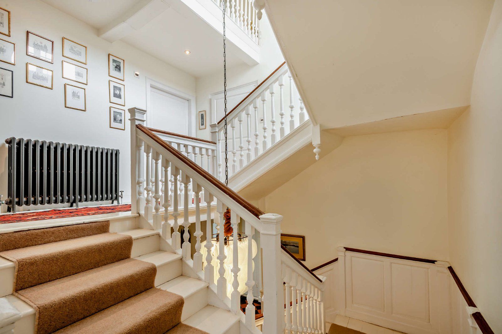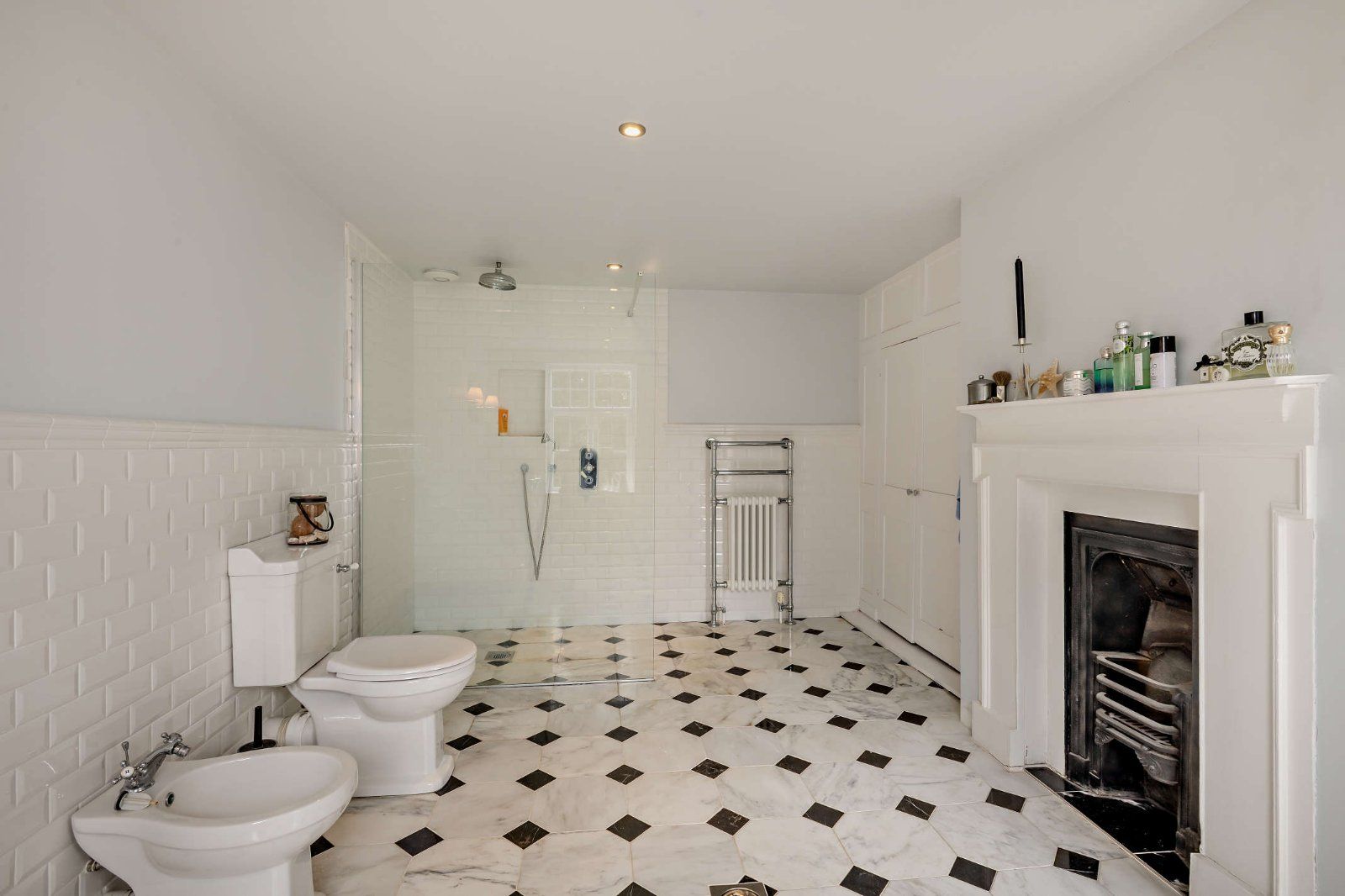 The generous first floor landing leads to an impressive principal suite, comprising a fully fitted dressing room and a large en suite shower room. Two further bedrooms and a study, also enjoying an array of fine traditional features and tranquil aspects, also occupy the floor, one with an en suite shower and w/c. On the second floor are four additional well-proportioned and bright bedrooms with elevated views, served by a large family bathroom with a freestanding bath.