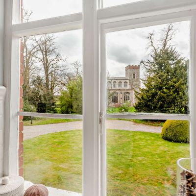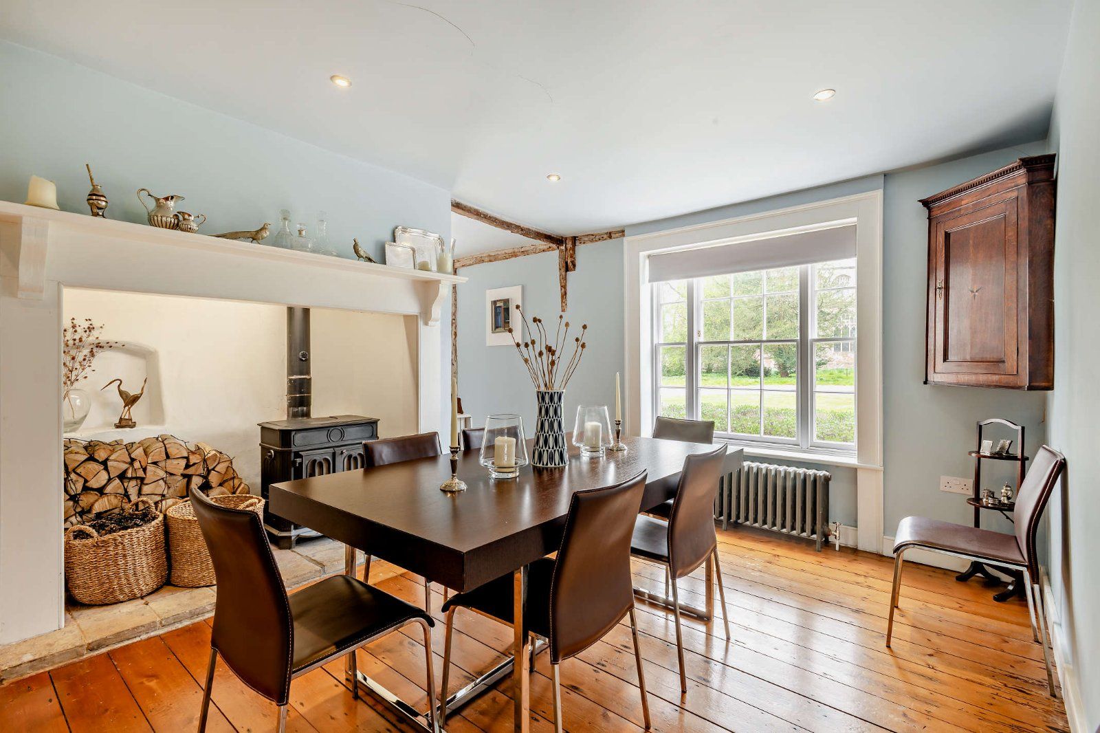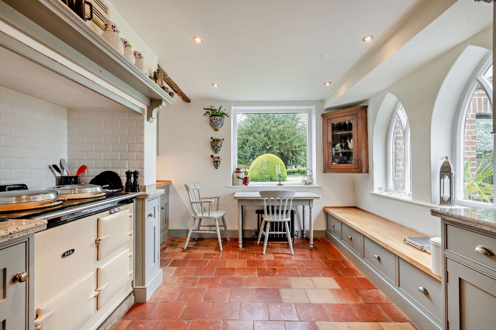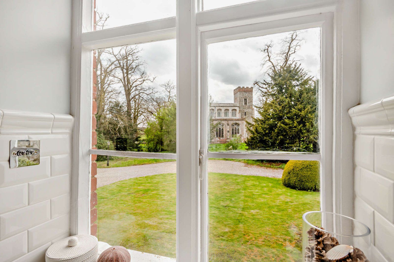 The welcoming reception hall with its checkerboard tiled floor and ornate 18th century turned staircase opens to the front-facing sitting room and adjacent dual-aspect drawing room, both with fine feature fireplaces and commanding views of the grounds. The drawing room flows naturally into a formal dining room with wood flooring and large Inglenook with log-burning stove, alongside which is a stunning kitchen breakfast room with Norfolk pamment tile floor, handmade shaker style cabinetry under marble work surfaces, double butler sink, cream AGA range and 5-burner gas hob. There is ample space for informal dining with a window seat beside dual arched frames and a picture window with view of the church. Further is a useful utility with laundry and store.
