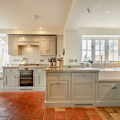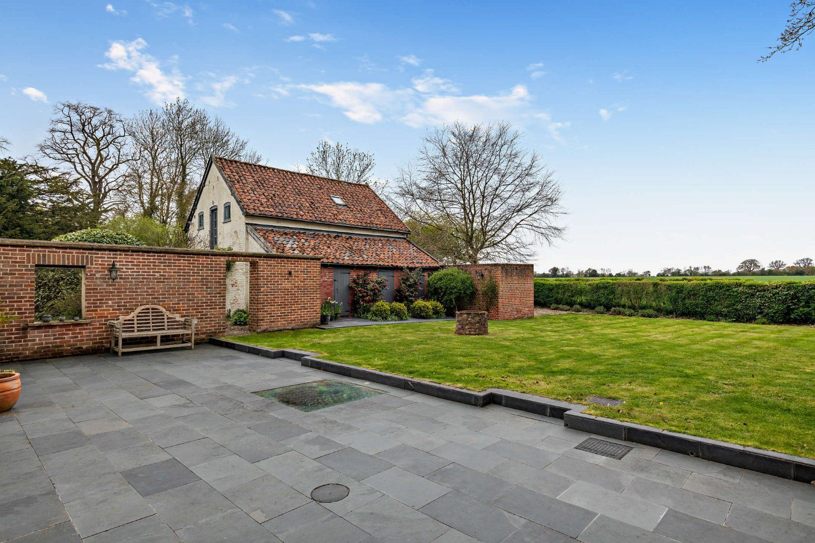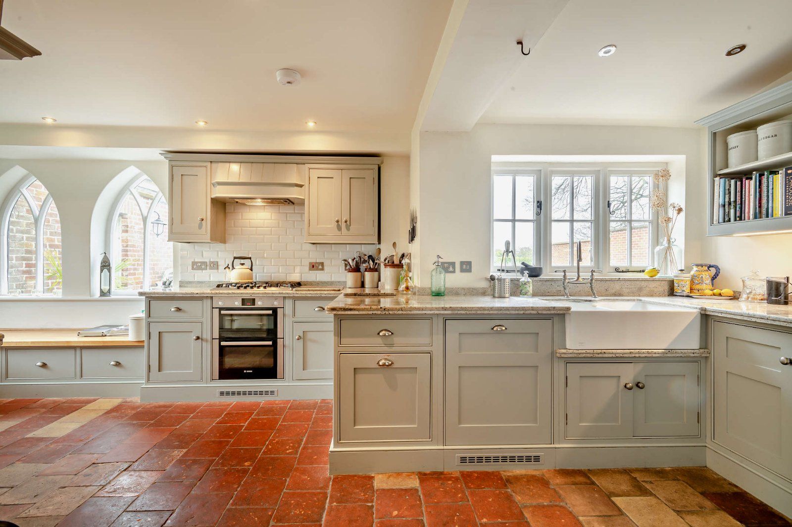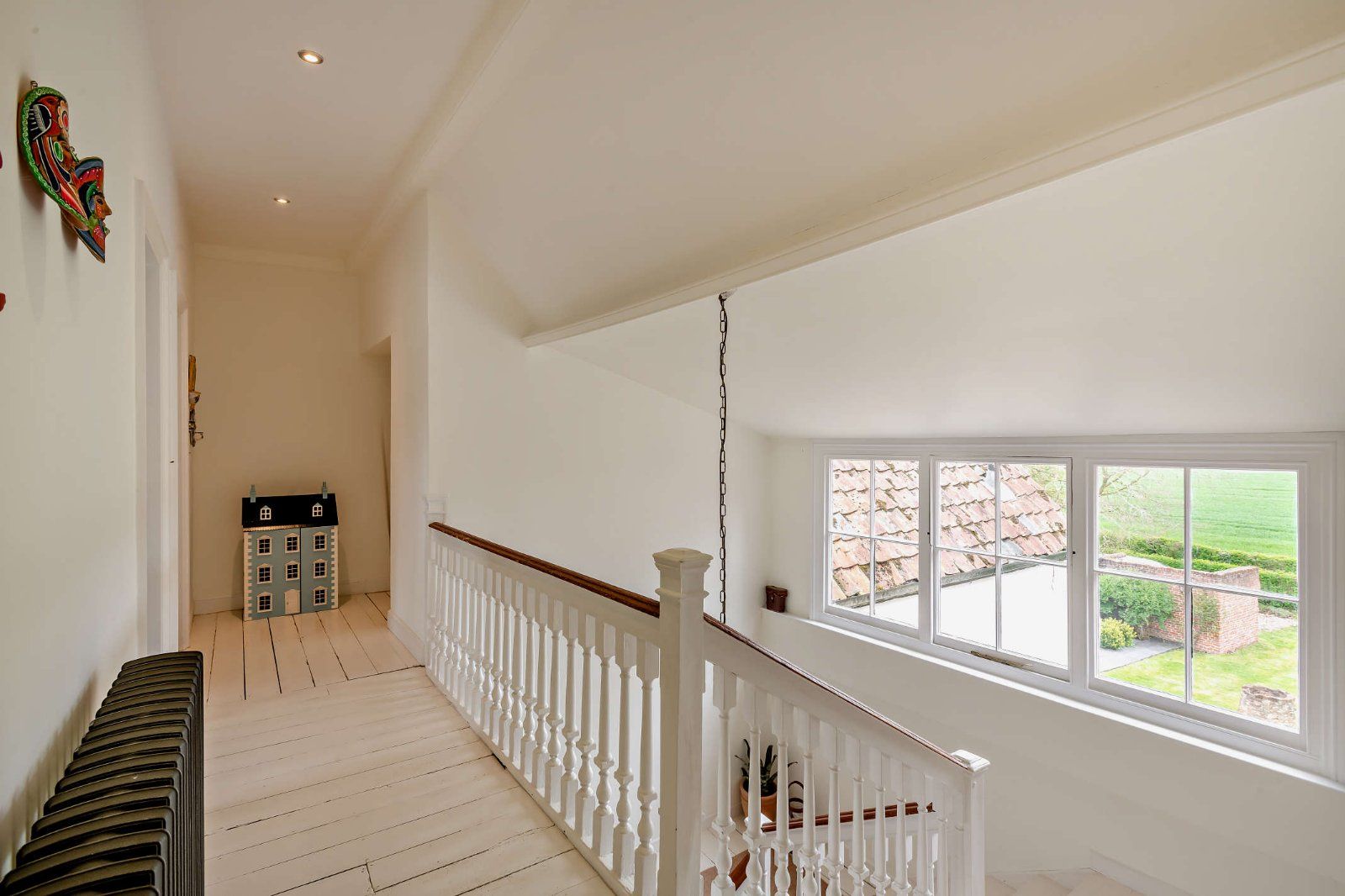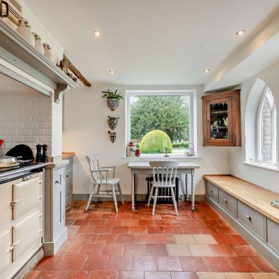 The welcoming reception hall with its checkerboard tiled floor and ornate 18th century turned staircase opens to the front-facing sitting room and adjacent dual-aspect drawing room, both with fine feature fireplaces and commanding views of the grounds. The drawing room flows naturally into a formal dining room with wood flooring and large Inglenook with log-burning stove, alongside which is a stunning kitchen breakfast room with Norfolk pamment tile floor, handmade shaker style cabinetry under marble work surfaces, double butler sink, cream AGA range and 5-burner gas hob. There is ample space for informal dining with a window seat beside dual arched frames and a picture window with view of the church. Further is a useful utility with laundry and store.