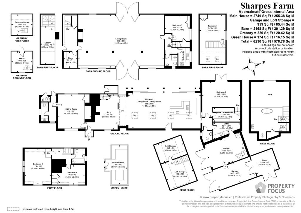 To the front of the house is a large gravel driveway with parking for several vehicles. There is a double garage and a tractor store which has a store room above it.