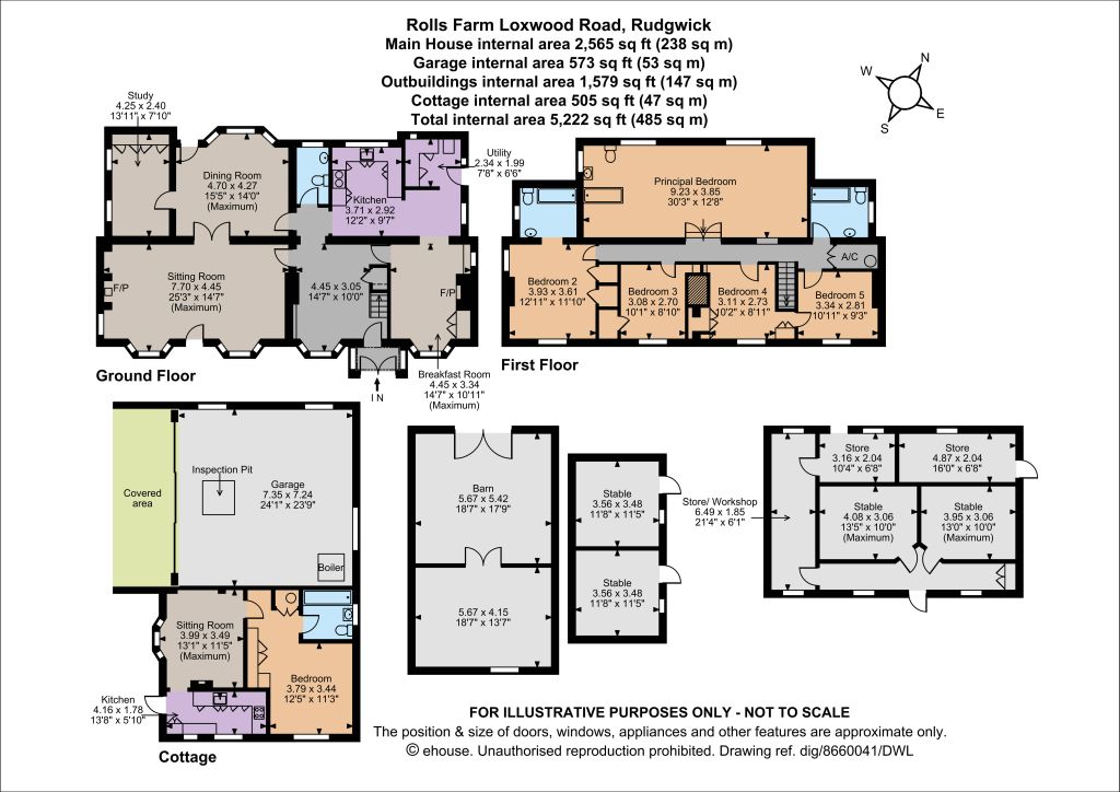 The property is approached via a tree-lined driveway, which leads to the house and to the courtyard for access to the outbuildings. These include a substantial garaging block with the adjoining cottage, a barn, a store and workshop with stables and a further storage building. The splendid gardens surrounding the house feature well-maintained lawns, border beds, various mature trees and a wealth of shrubs and hedgerows, as well as gravel terracing and patio seating areas. Beyond the gardens there are paddocks and meadows, as well as a pond, all backing onto beautiful open countryside. In all the plot extends to 15.42 acres.