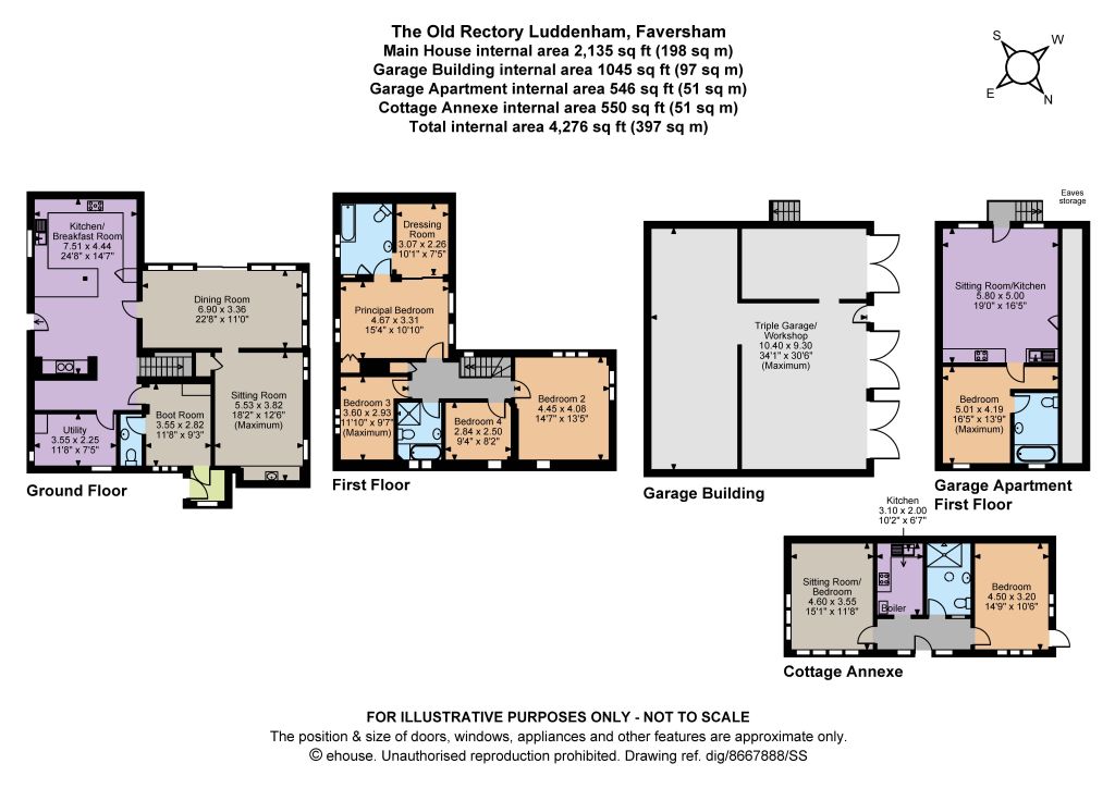 Garage Apartment An external staircase attached to the triple garage leads to the vaulted first floor apartment, comprising an open plan sitting room/kitchen, a double bedroom and a bathroom. There is substantial storage space above and to the side of the apartment.