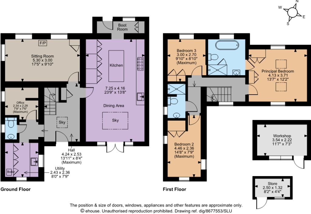 There is space for a family dining table, while the kitchen itself is fitted with shaker-style units, a central island, a butler sink and a stainless steel range cooker with a six-ring gas hob. The utility room provides additional space for home storage and appliances with built-in cupboards, a wooden worktop and a butler sink. Additional reception space is provided by the cosy sitting room with a Stockton 5 gas wood-burner effect stove. A small home office has floor-to-ceiling shelving. The ground floor has engineered French oak flooring throughout with underfloor heating, excluding the study and cloakroom which have radiators. The quarter-turn staircase leads from the entrance hall to the first-floor landing and the three beautifully appointed bedrooms, each with their own unique soft colour palette. Two of them have views of Peter Pond. The principal bedroom has a vaulted ceiling with dual skylights and built-in storage. The en suite bathroom has underfloor heating, a freestanding roll-top bathtub, and a separate shower unit with a rainfall shower head. Between the other two bedrooms is a family shower room with underfloor heating. The loft has two access hatches and flooring, making it ideal for home storage.