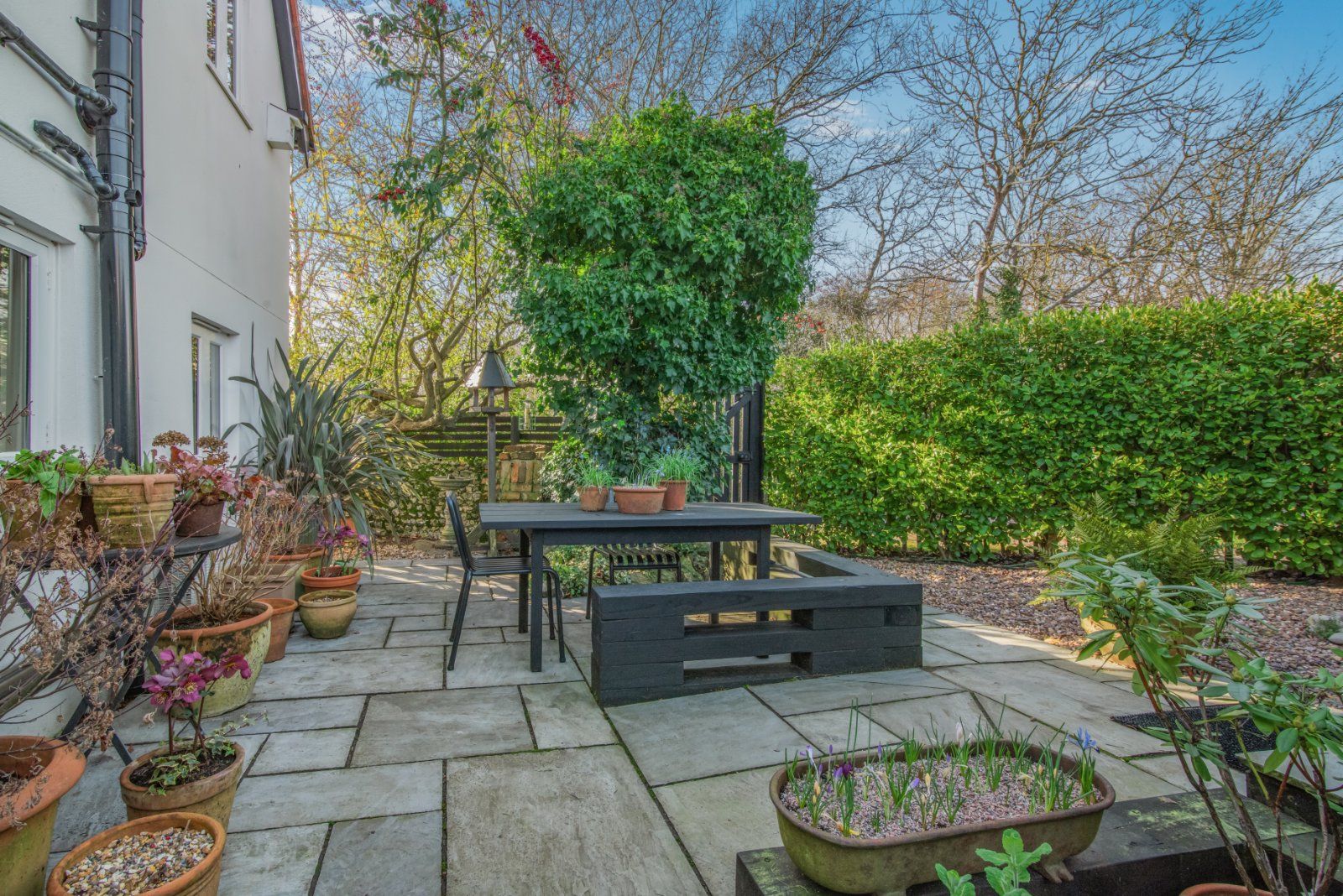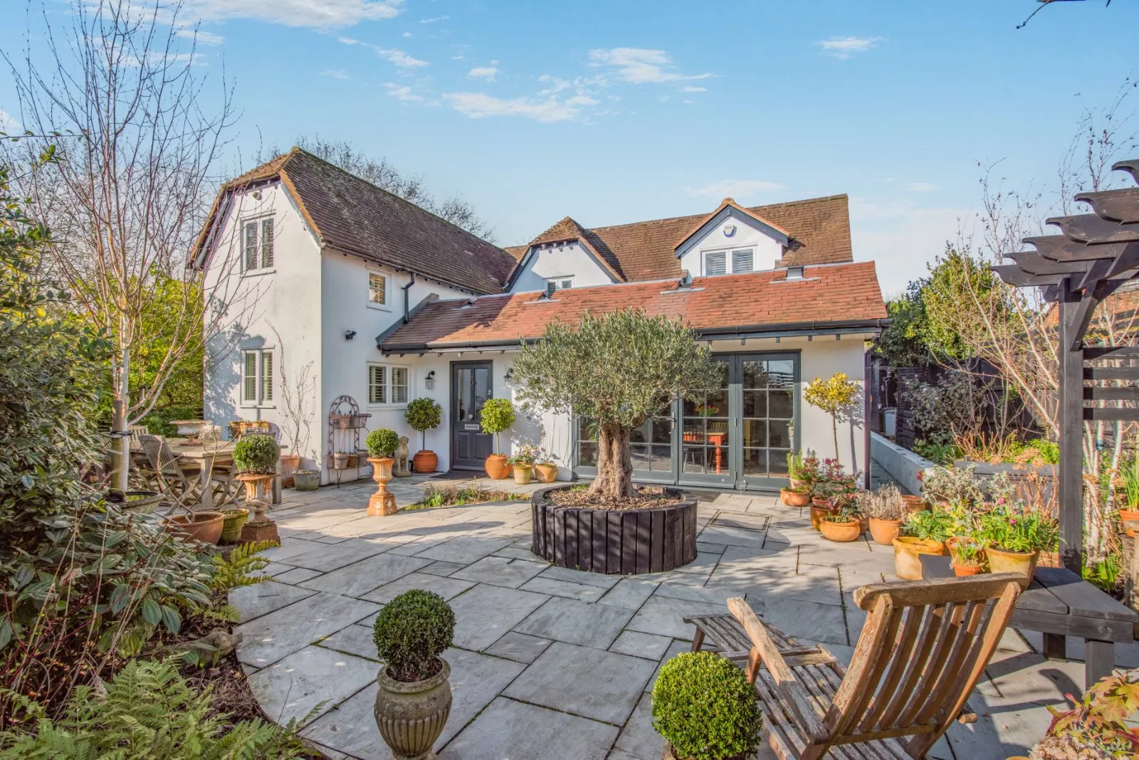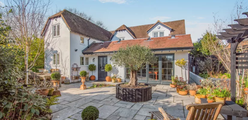 In 2022 Rookery Cottage was completely gutted, and a single story extension added. It was renovated to a high standard with elegant, thoughtful styling and contemporary finishes throughout. Extra land was obtained from neighbours on either side. A welcoming reception hall has a skylight overhead, allowing plenty of natural light. The main everyday living and entertaining area is the bespoke kitchen and dining area, with a large custom-made skylight and a built-in floor-to-ceiling bookcase. Timber patio doors and side glazing overlook the South-East facing garden.