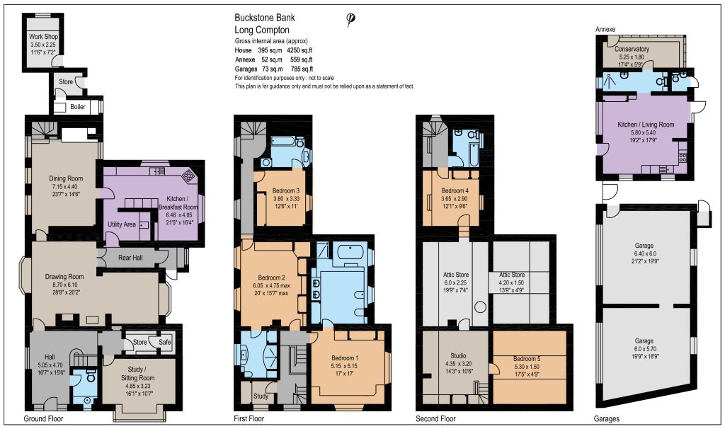 To one side is the study/sitting room with adjacent store room. The drawing room has bay windows on two elevations and an inglenook fireplace, with log burner, and a door into the dining room with inglenook fireplace and secondary stairs. From here a door opens into the recently fitted bespoke kitchen/breakfast room, which is fully equipped with double electric range Everhot oven, breakfast area, arch through to utility area and French doors onto the garden terrace. From the hall, the main staircase rises to a landing where there are three en-suite double bedrooms and a study. Stairs continue to the second floor to bedroom 5, a studio and excellent attic storage. From an inner landing and approached from the secondary stairs another staircase rises to bedroom 4 with adjacent bathroom.