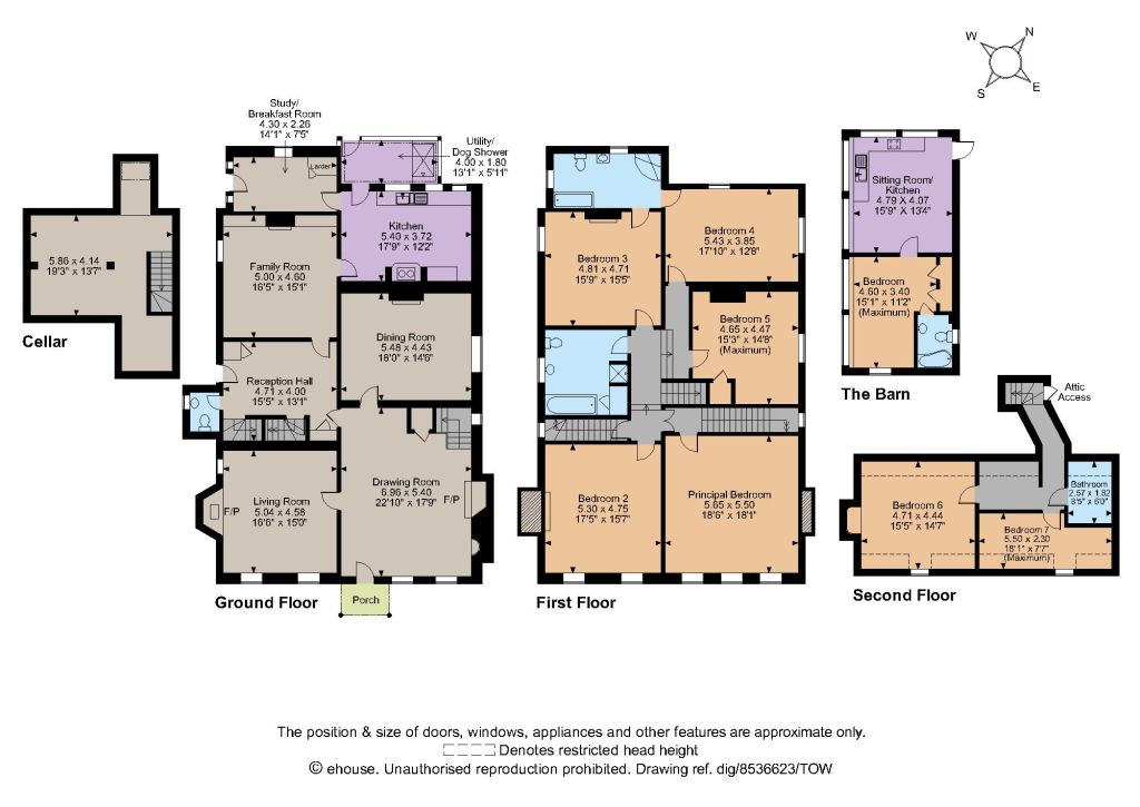 To the rear of the house is a fabulously large reception hall, off which is a cloakroom and access to the cellar, garden and a secondary staircase to the first floor. The family room, fitted with bespoke bookshelves and wood-burning stove is also found off the reception hall.