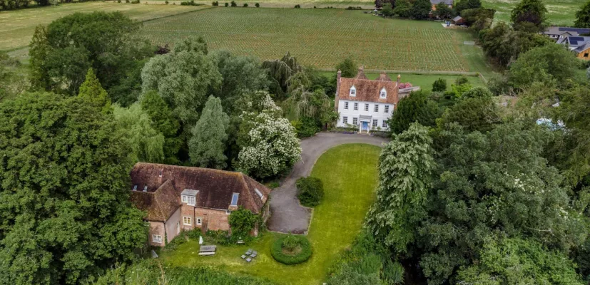 To the eastern side of the house are further lawns, which are split by a magnificent yew hedge, which creates a tranquil area where the partly walled rose garden and the sheltered heated swimming pool are found. There are lovely views across a neighbouring vineyard towards the North Downs.
