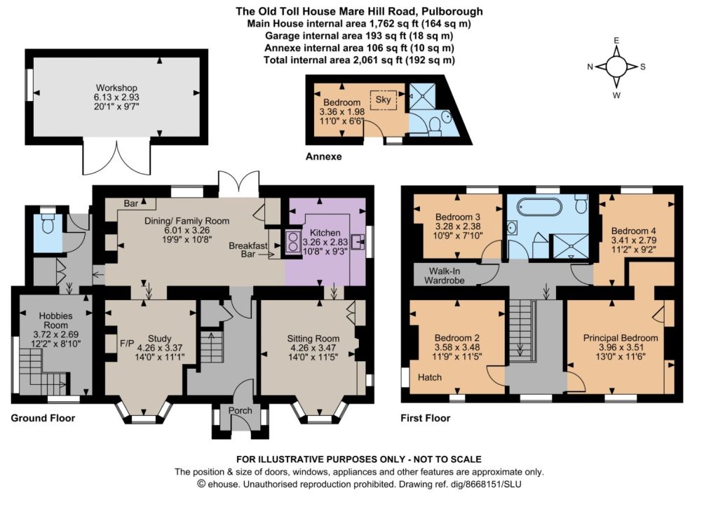 A pathway and steps lead to the front porch and entry for vehicles is via a shared driveway at the side, which leads behind the house to the detached workshop/ garage and plenty of parking space. Access to the annexe is via the rear of the house, while there is also a patio area, outside kitchen and barbecue area. The gardens to the side are laid to lawn and bordered by established hedgerows, as well as a patio area, partially shaded by a wooden pergola.