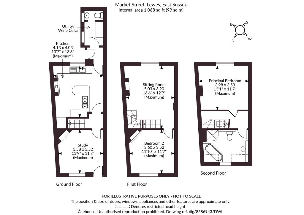 This delightful period property combines traditional architecturalcharacter with distinctive, contemporary styling, offering morethan 1,000 sq ft of well-presented accommodation arrangedacross three floors.The ground floor opens into a versatile study, currently used asa formal dining room, featuring cushioned wood effect flooringand a wall of integrated shelving, working fireplace. The kitchenforms the heart of the home and is particularly characterful,fitted with shaker-style cabinetry, a breakfast bar, alongside astriking exposed brick chimney breast housing a wood-burningstove (currently capped). To the rear, a useful utility area,cloakroom and wine cellar provide excellent additional storageand practicality.On the first floor, a spacious sitting room benefits from largedouble glazed windows, allowing for good natural light, while awell-proportioned double bedroom with a feature fireplace andfitted shelving lies adjacent. The second floor is dedicated to theprincipal bedroom and family bathroom. The principal bedroomenjoys elevated views across the rooftops of Lewes towards theSouth Downs, while the bathroom is generously sized and fitted with both an oversized bath and separate shower.