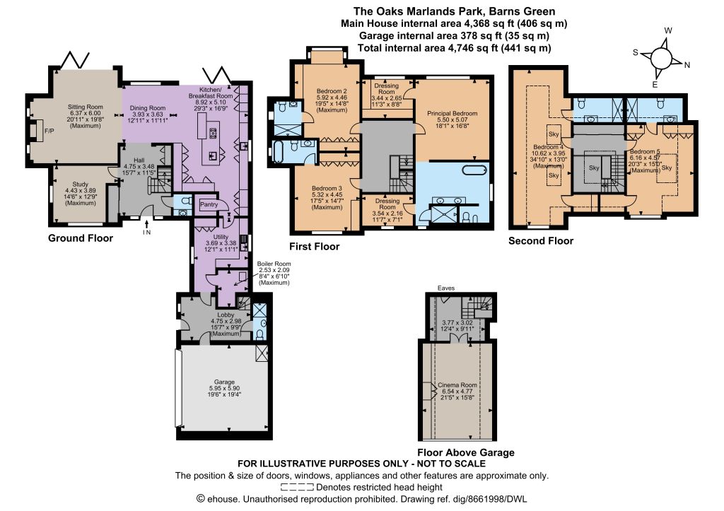 The first-floor landing leads to three generous, luxury double bedrooms, including the impressive principal bedroom with its two dressing rooms and large en suite bathroom,with Italian fixtures, shower is also a steam sauna. The second and third bedrooms are also en suite and benefit from built-in wardrobes, while stairs lead to the second floor where there are a further two double bedrooms en suite. A second entrance to the property provides additional access into the utility room on the ground level, with stairs leading to the cinema room above the garage, with its built-in projector.