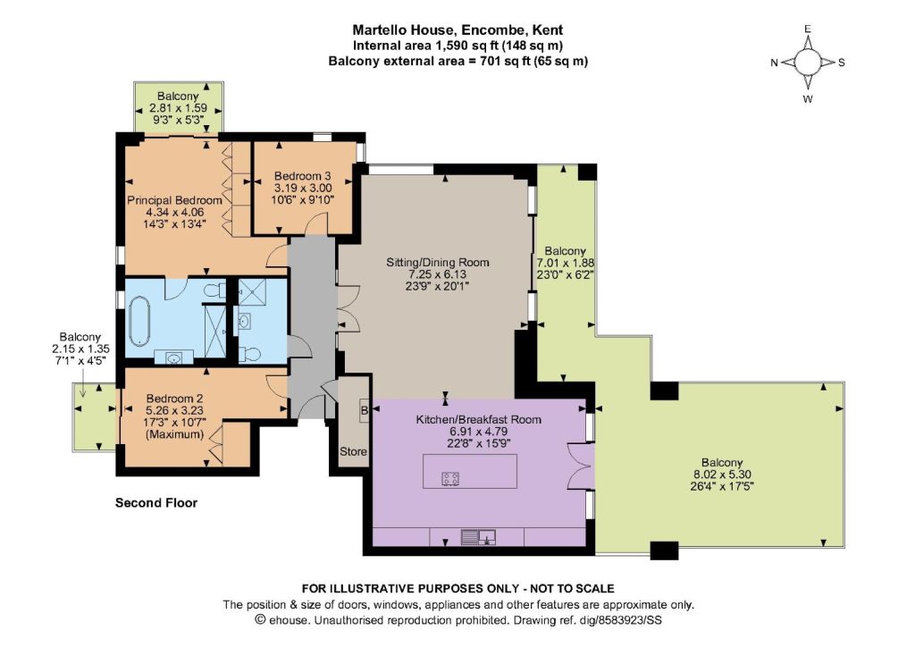 The apartment has three bedrooms, with the principal bedroom having a luxurious en suite bathroom featuring a stylish freestanding tub and walk in shower; the room has sliding doors to the east-facing balcony. A smart shower room is accessed from the hallway, where a generous storage cupboard provides space to store outdoor wear and conceal domestic paraphernalia.