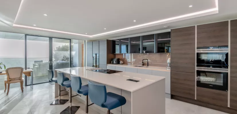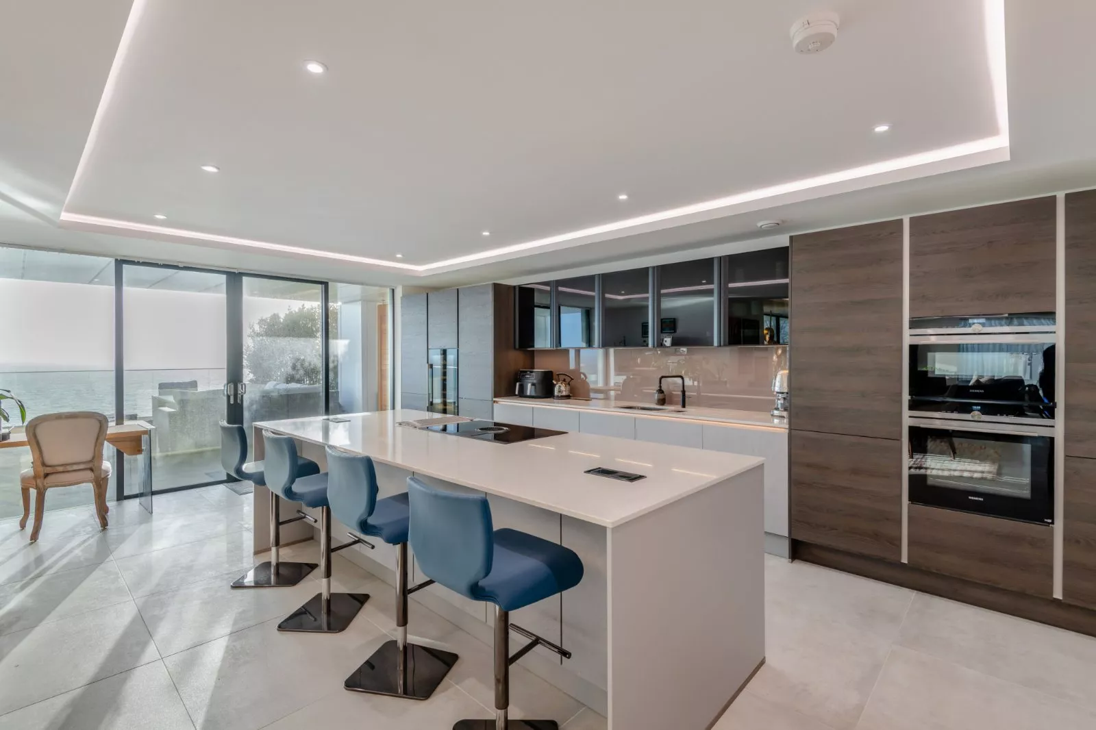 Part-glazed, double-doors open from the reception hall into the elegant sitting/dining room with the adjoining kitchen/ breakfast area, providing a convivial space where the impressive outlook towards the sea takes centre-stage. Adding character and dimension to the kitchen, fittings feature sleek two-tone cabinetry, and include stone work surfaces, integrated appliances and an island unit with breakfast bar which creates a subtle divide within the space. Picture windows ensure uninterrupted Channel views and two sets of glazed doors provide a seamless connection to the outdoor terraces.