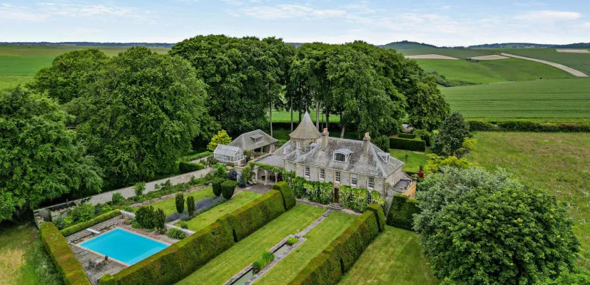 The Gardens And Grounds The gardens to the south are divided into four “rooms” separated by high yew hedges. The first contains a long flower border leading to the garden gate onto the “Roman Road”, two areas of lawn and the swimming pool, which is secluded behind stone walls. All this is overlooked by a grape-bearing, vine-clad Loggia with a mural of south west France. The next is a formal area, mainly laid to lawn, with a central canal and wisteria-clad arbour at its end. Adjacent to this is the third, larger, open area of lawn. The last “room” is a private paved garden with a round pool and slate steps leading from the sitting room. In addition, to the west of the house is an area well planted with a variety of trees and to the east, a downland “meadow” of 3 acres surrounded by stock fencing and mixed hedges of about 10 species, with a small copse including fruit trees. The heated swimming pool is protected by an electric Dripool safety cover, which slides under the paving when open