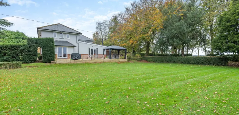 Swathes of lawn offer a soft-surface playground for children and paved terracing to the side and rear of the home provide opportunities for al fresco dining and relaxation. The majestic mature trees are striking natural features, whilst views from the garden include the rolling hills of the adjoining farmland and the sea.