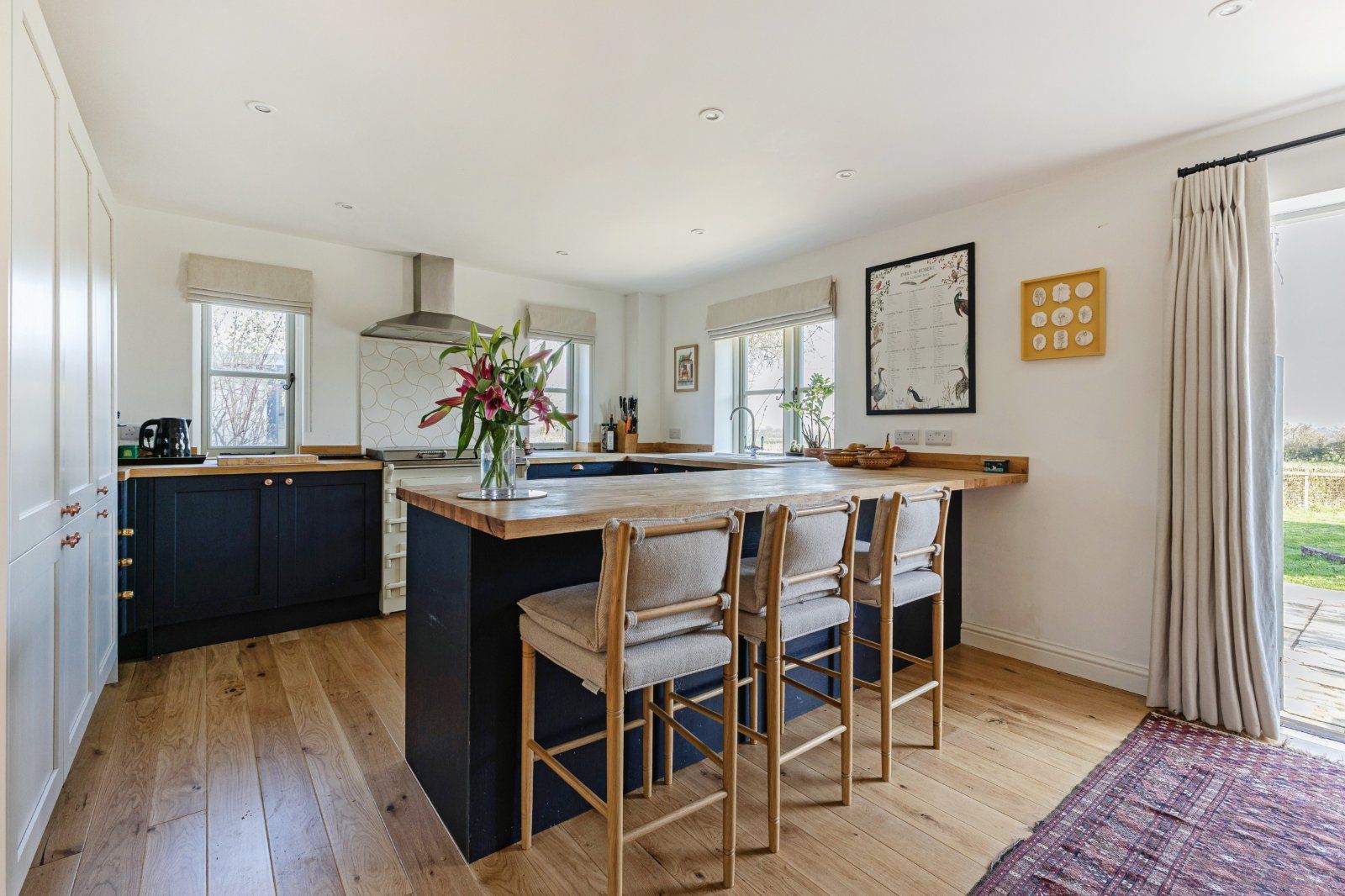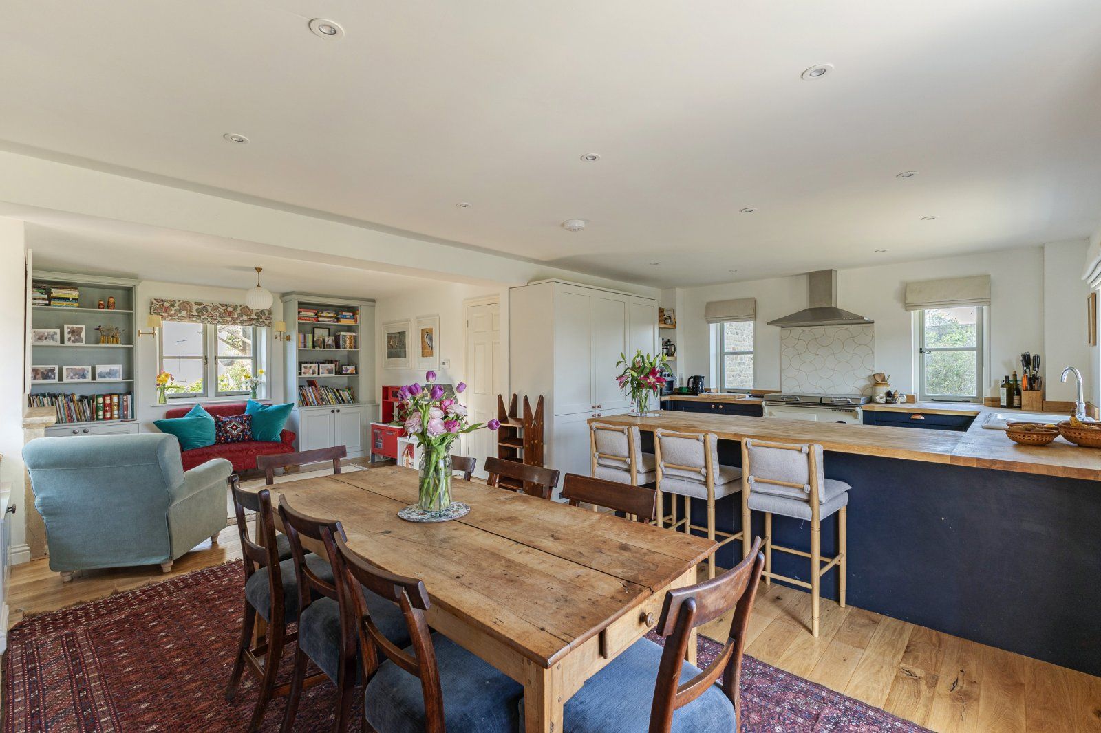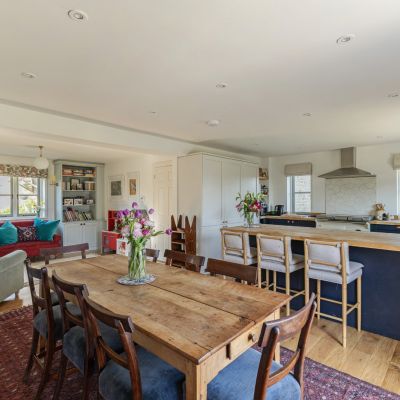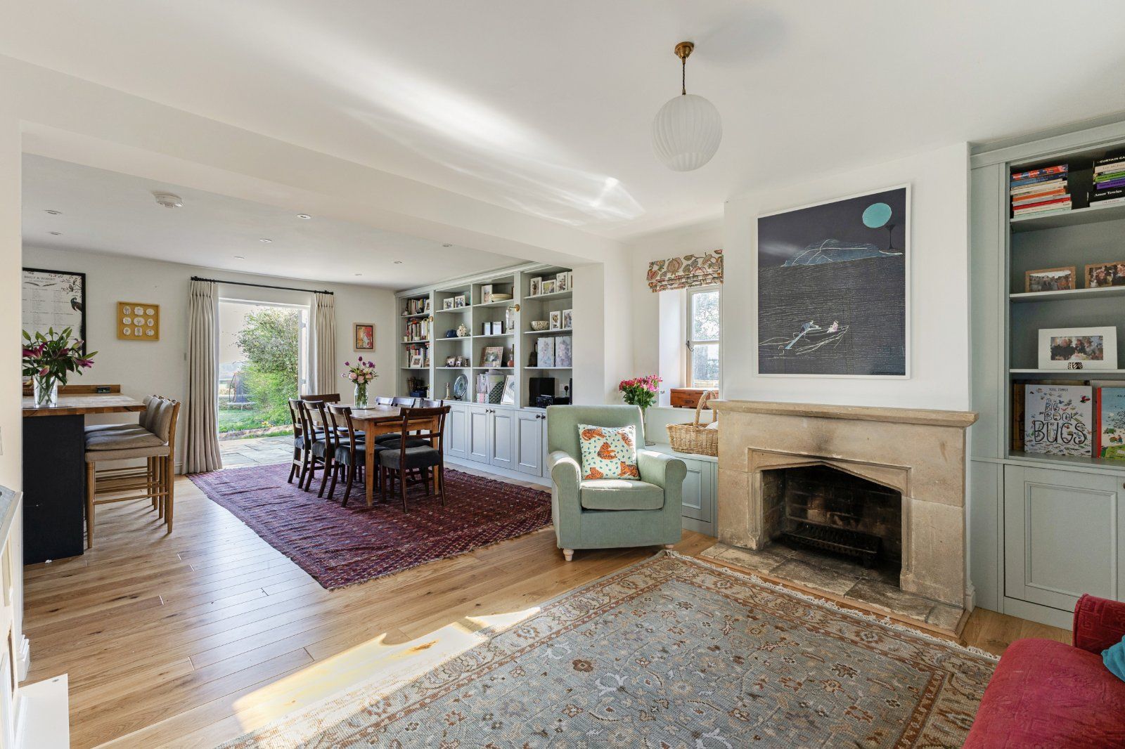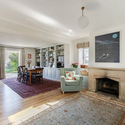 The adjoining dining area comfortably accommodates a large table, while the sitting area, centred around a limestone fireplace, creates a relaxed and welcoming space for informal gatherings.