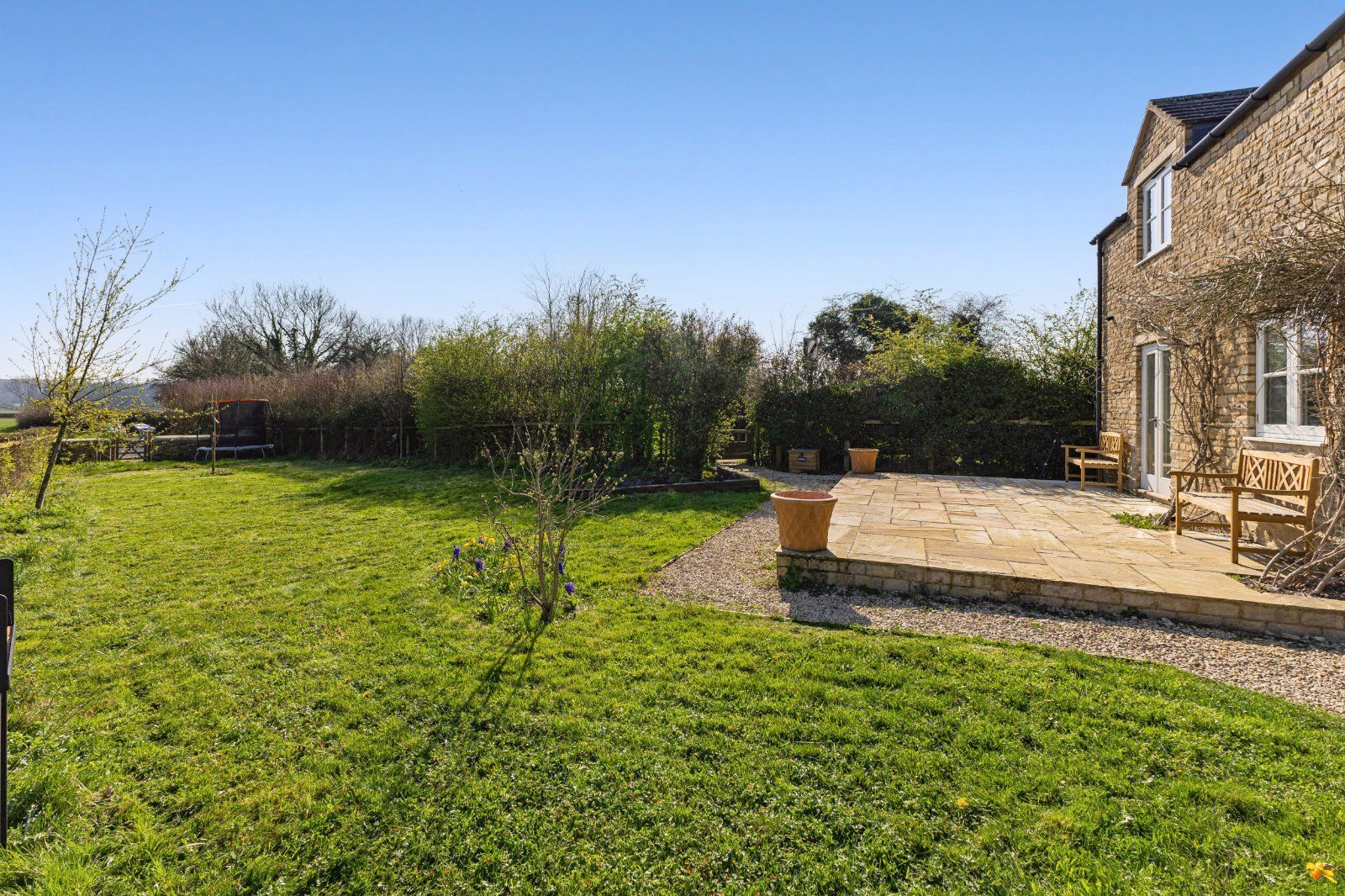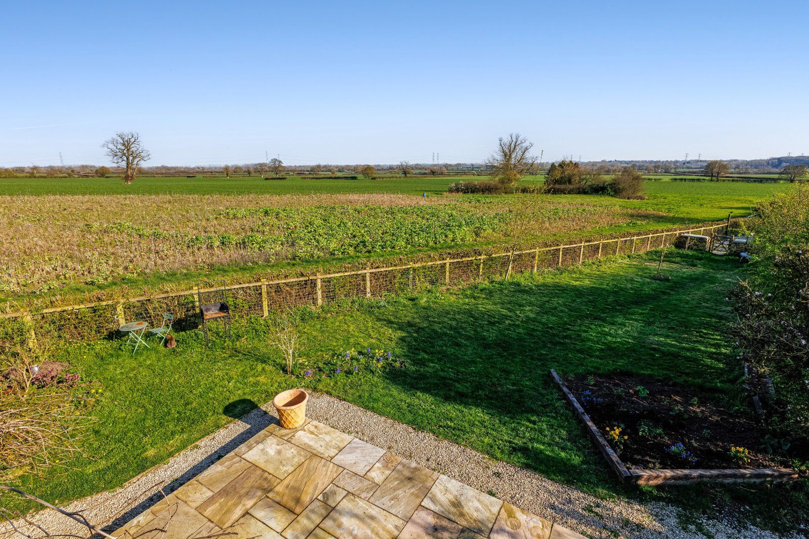 The main garden lies to the side and rear and is predominantly laid to lawn, with established shrubs and borders providing structure and privacy throughout the seasons. A gravelled terrace offers an ideal setting for outdoor dining and entertaining, enjoying uninterrupted views across the adjoining countryside and reinforcing the property’s semi-rural feel.