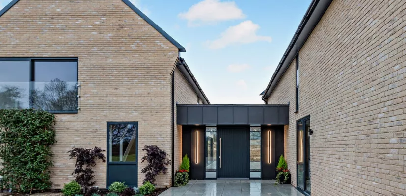 Constructed of brick with a slate roof and ample full-height windows and doors to encourage the outside in, Folly House is designed as two wings which flow from a central entrance hall with a glazed wall, drawing the eye to the south facing rear terrace.