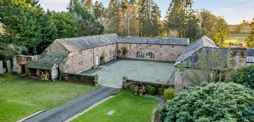 The property is approached through a five-bar gate and a tarmacadam driveway flanked by lawn, leading to a cobbled courtyard providing ample parking. The garden is mainly laid to lawn, screened by mature trees. There are three outbuildings, a log store, an open store, Gabriel Ash greenhouse, and a paved terrace accessed from the sunroom and kitchen/breakfast room. The south facing terrace is ideal for al fresco dining and entertaining, offering views over the garden and neighbouring countryside.