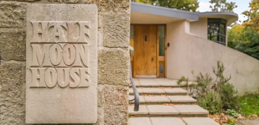 The open-plan living area is the heart of the house, framed by a stunning 10ft high sweeping circular ceiling in a half-moon shape, composed of exposed radiating joists and subtle concealed lighting. With its enormous picture windows and three large glass doors that overlook the verdant garden beyond, Half Moon House is fantastically bright. Timber mullions frame the space, creating a wonderful play of light, and lend a sense of harmony with the natural world outside. The award-winning, bespoke kitchen with handmade, purpose-built units is open to the living room, with its boundary defined by a timber bench that contains excellent amounts of storage space. Circular windows curve around the room, illuminating the work surfaces and the mottled blue tiles of the splashback. A mixture of open shelving and built-in timber cabinetry complete the space. The current owner quotes, ''walking barefoot on the underfloor heated stone tiled flooring, in the light filled, Half Moon roundness of the house, under the fan shaped ceiling, is a bit like walking on the warm marble of the Taj Mahal on a cool evening. The architect and builder obviously understood the Chinese Art of Placement (Feng Shui). It can be seen in the fact that the front and back door do not face each other in a straight line (which would be bad feng shui). Instead, there is a slight bend even in the seemingly straight part of the house."