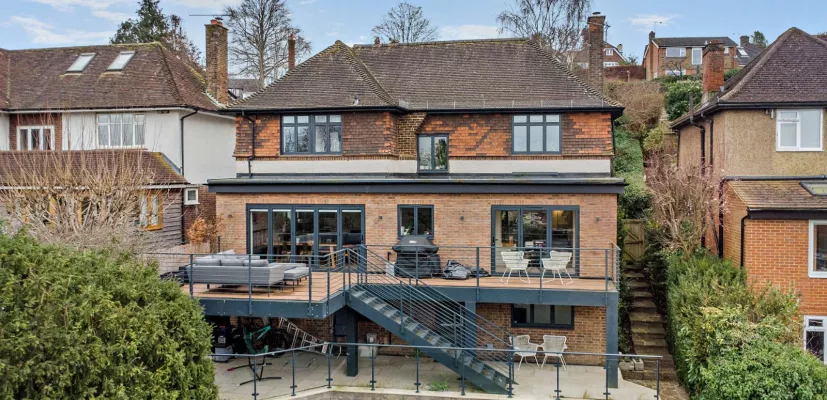 A stylish detached family home with terraced gardens and sweeping views across Guildford