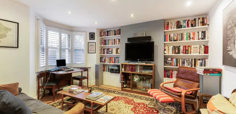 Upon entry the property benefits from a lovely reception room with bespoke bookshelves and cabinetry, the kitchen has direct access to the large south facing garden. Also located on this level is a guest bedroom and bathroom. On the raised ground floor there is another double bedroom with en-suite bathroom.