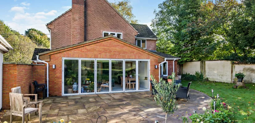 The main ground-floor reception is the sitting room, with its wooden flooring and fireplace fitted with a woodburning stove. Double doors connect to the light and airy garden room with its skylight and bi-fold doors opening onto the west-facing gardens.
