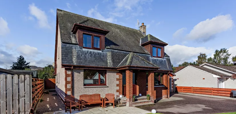 At the front of the property is a driveway providing parking space and to the side is the detached garage. The front gardens feature an area of lawn, bordered by fencing, as well as a patio area from which to enjoy the views towards the Highland landscapes. At the rear there are west-facing gardens with an area of timber decking for al fresco dining, with gravel terracing beyond, all bordered and enclosed by high timber fencing for a sense of privacy.