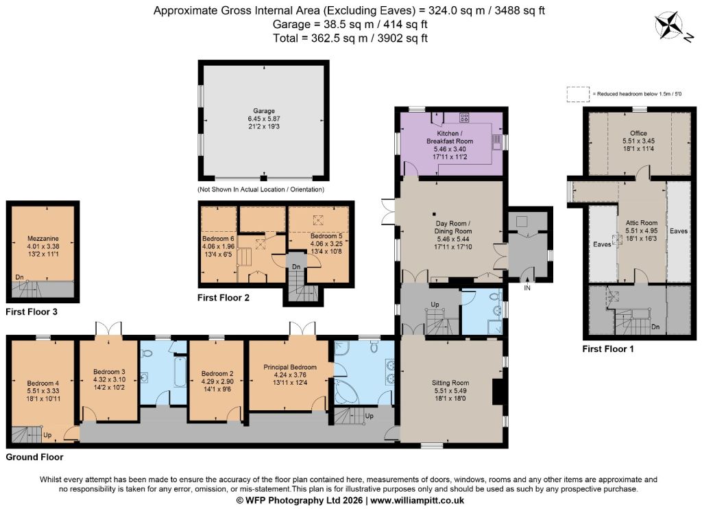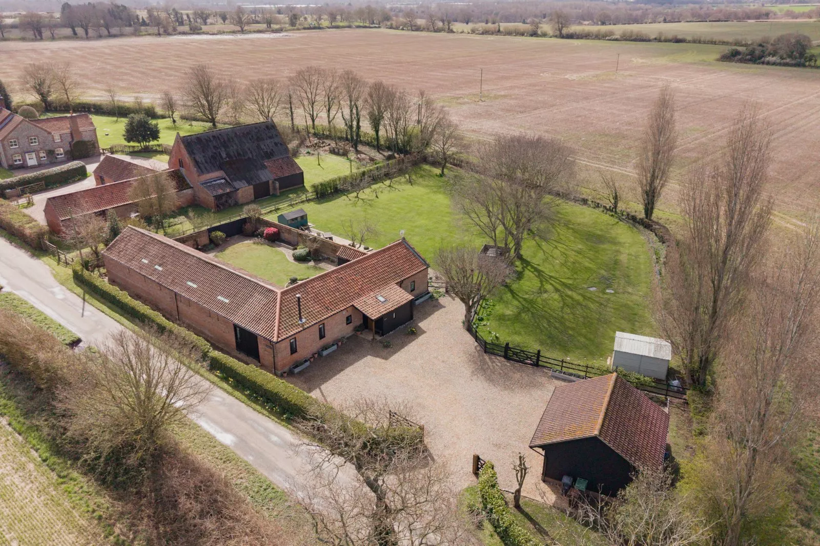 Pilgrims Hill is a delightful and spacious detached barn conversion, originally part of the Honing Estate. The name derives from the Celtic cross which can be found nearby along a public footpath, said to have been part of a pilgrim’s route. The flexible accommodation extends to 3488 sq ft and provides comfortable, characterful reception rooms, including an impressive sitting room with wood burning stove and high vaulted ceiling. Also within the property there are areas of exposed brick walls, exposed floor boards, and timbers. The kitchen has been recently remodelled to include integrated fridges and freezer, dishwasher and range cooker. The principal bedroom with an updated en-suite bathroom is on the ground floor, with a further three bedrooms, one with a mezzanine, and a modern family bathroom. There is a separate utility room/WC with plumbing for a washing machine and a boiler room/airing cupboard with new condensing boiler, On the first floor there are four further rooms accessed via two staircases, currently configured as one bedroom, an attic/play room with extensive eaves storage and two studies.