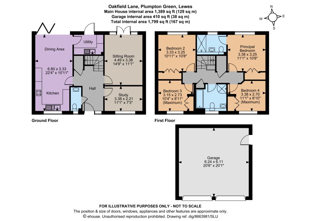 Stairs rise from the reception hall to a generous first floor landing with further useful storage. It gives access to principal bedroom with built-in storage and an en suite shower room. The first floor also houses the property’s three remaining double bedrooms, all with fitted wardrobes, together with a family bathroom with bath and separate shower enclosure.