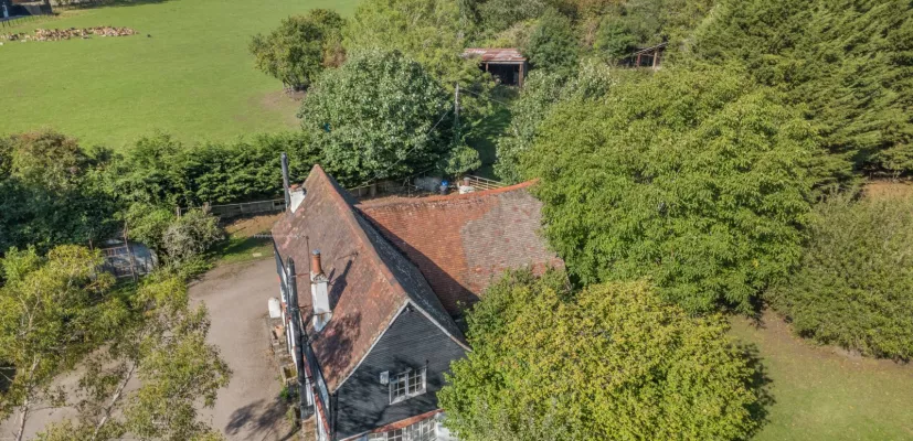 Traditional 16th century timber framed cottage with later 20th century additions, Woodlands is Grade II listed and believed to be one of the oldest properties in the village. In need of renovation and set back from the road with a long driveway and gated approach, the property is being ‘sold as seen’, which includes a variety of old barns and buildings that are scattered throughout the wooded plot that totals almost 6 acres.