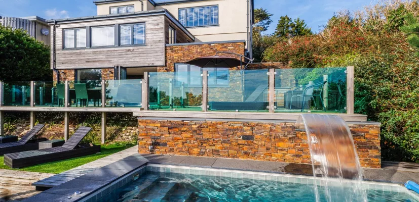 The south facing gardens are a true highlight, carefully designed to make the most of the setting and providing excellent space for relaxing and entertaining. A wide timber deck stretches the full length of the property, framed with glass balustrades and stonework that add both elegance and openness to the space. From here, steps lead down to a secondary terrace and to the impressive, heated swimming pool, complete with multi-jet directional flow, water fountain, and adjacent outdoor shower. Beyond, a lawned garden is framed by mature shrubs, pine trees, and established hedging, ensuring privacy. What truly sets this home apart are the sweeping, uninterrupted coastal views available from every level of the garden. A180-degree panorama stretches across Start Bay and the English Channel, taking in Start Point, Blackpool Sands, Strete Gate, Torcross and Beesands.