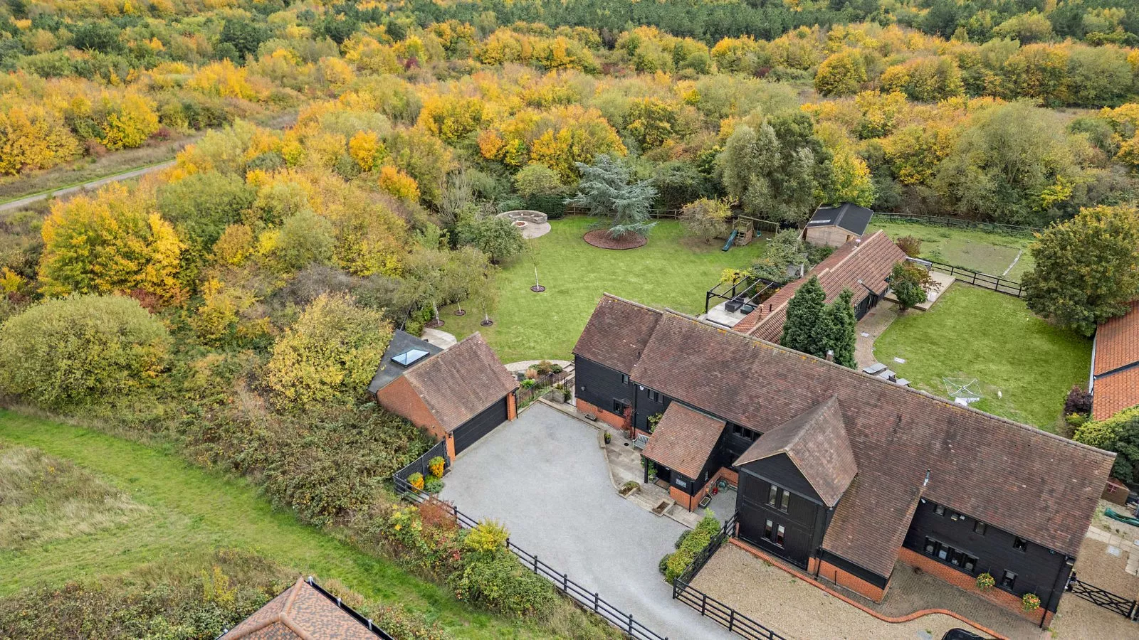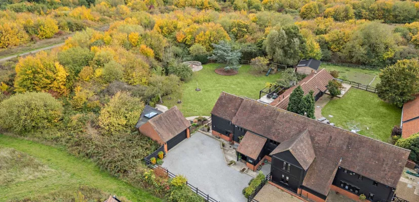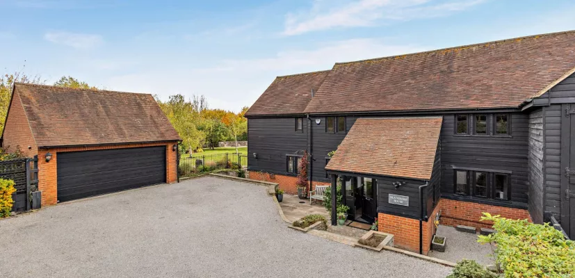 Blackbarn House is an exceptional semi-detached converted barn set within a small, exclusive development surrounded by the rolling parkland of Harold Wood and Pages Wood. Behind its distinctive black timber cladding, the home combines rustic character with sleek modern design, offering light, open-plan living and superb attention to detail throughout.