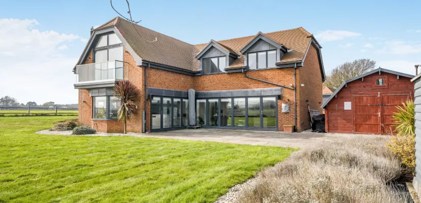 Timber gates, set in brick pillars, open onto a swathe of gravelled driveway with ample space for parking, in addition to the double garage. A low level retaining wall and a series of steps mark the access route to the front entrance and gravel pathways lead to either side of the house. Much of the garden is laid to lawn with timber post-and-rail fencing at the boundaries affording seamless vistas to the surrounding fields. There is a paved terrace adjoining the rear of the home which enjoys a south-easterly aspect and provides a sheltered setting for outdoor dining, relaxation and entertaining.